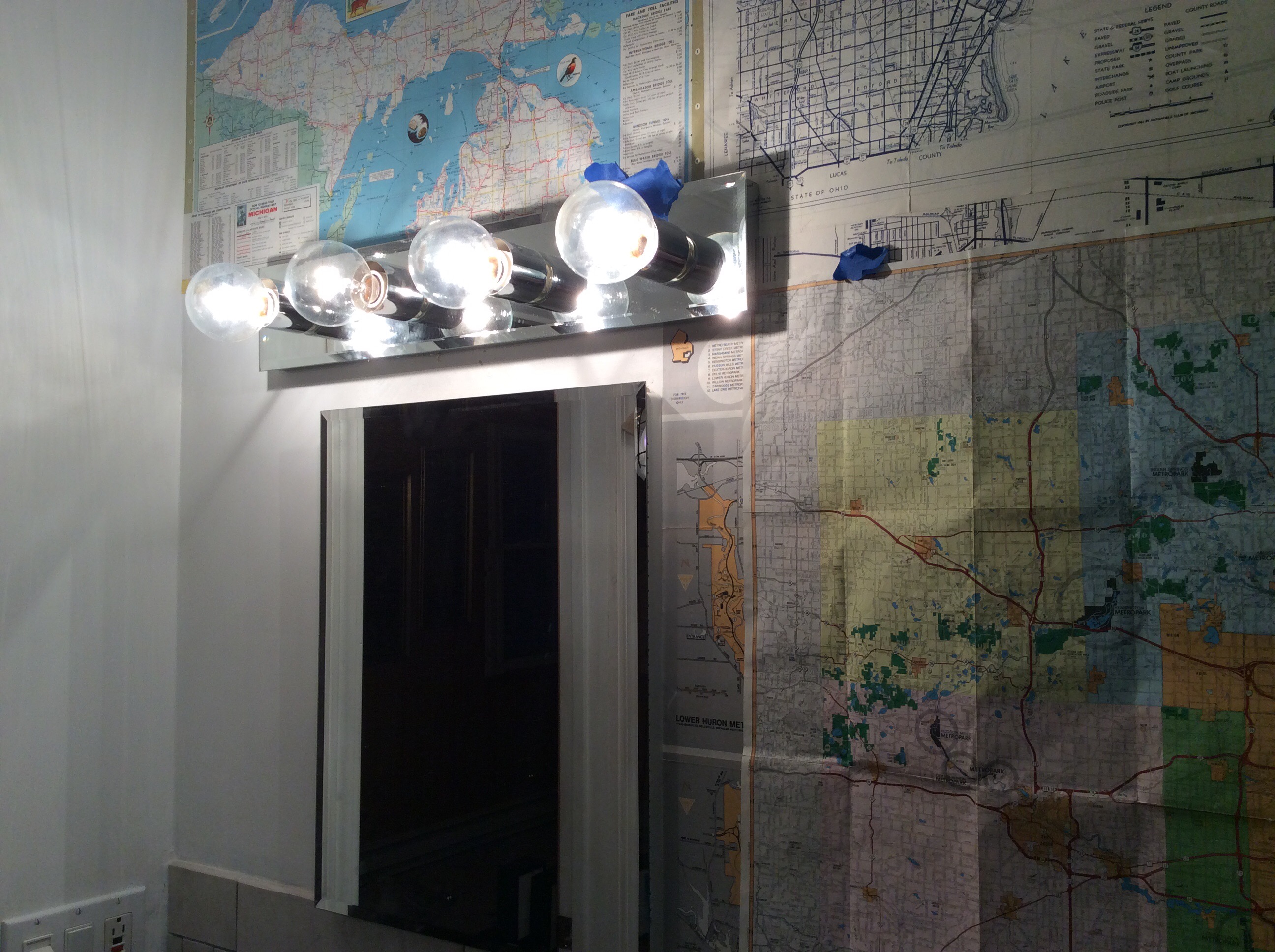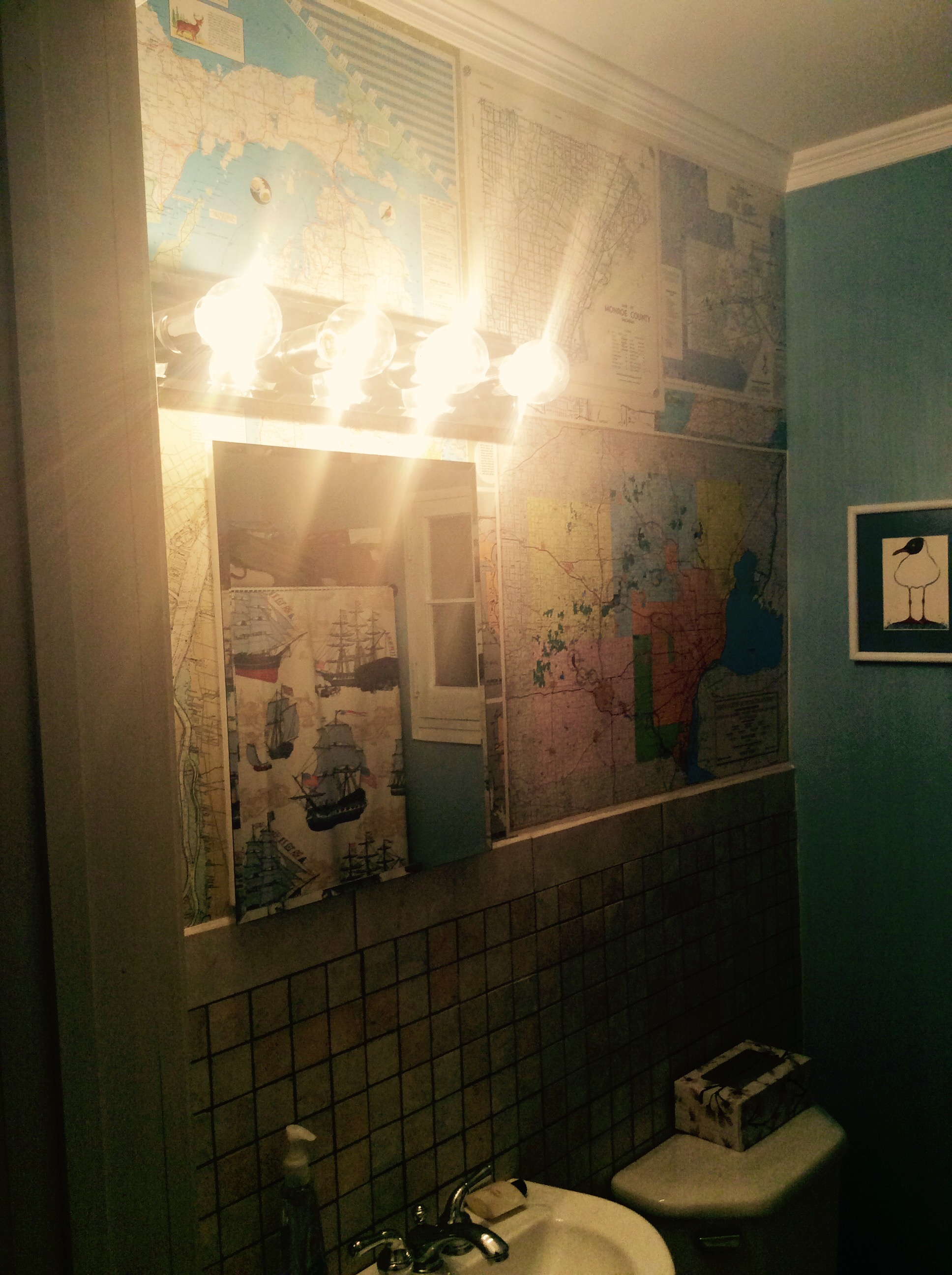 So with the window problem seemingly fixed, I proceeded to work on improving the small bathroom’s appearance. A collection of old maps provided inspiration for a decoupage map wall. We had way more maps than wall space, so Jeff and Mike got tasked with selecting the best ones and choosing their placement.
