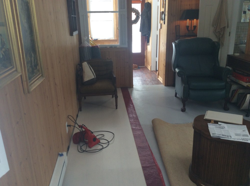 I of course still needed an underlayment; I ended up using a thin fiber layer from the fine folks at Ann Arbor Carpet (they were very, very nice). Here’s a photo of the floor in progress. You can see my fiber underlayment (plus vapor barrier) in red in the center, the old carpet on the left, and the Tundra in white on the right.