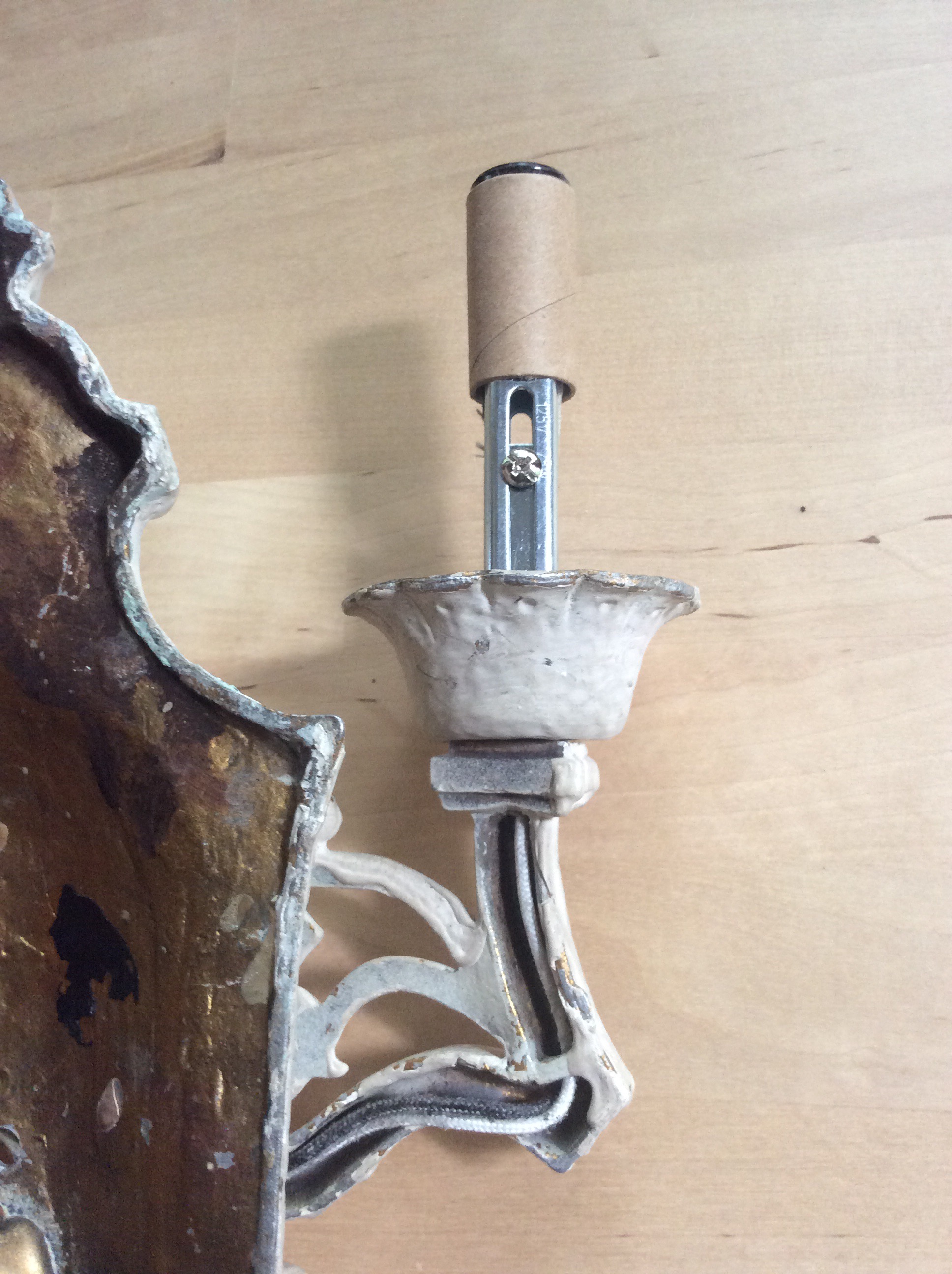 While he did a great job with the rewiring, he installed lamp sockets. (Unfortunately I didn’t take a photo of them at this stage.) Not to be overly picky, but considering the design of the lamp they definitely need the thin candelabra-style sockets (that you now see). But I though, well, no big deal, I can swap those out myself. So I paid for the work and left. Here’s a photo from behind, showing the rewiring. He did a nice job in the back, and installed an on/off push button switch on the front.
