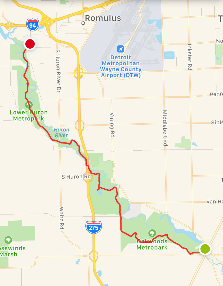 Here’s a photo of the route. This section is very different from the previous paths, which were through urban/suburban/industrial areas. This walk was almost exclusively through “metroparks.” Should I know what a metropark is? I mean, I can put two and two together to figure it out–seems like a state park, not a city park, not a county park, but a multi-county system of parks. But there were no metroparks where I grew up, so it’s a new concept to me.
