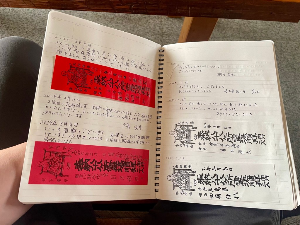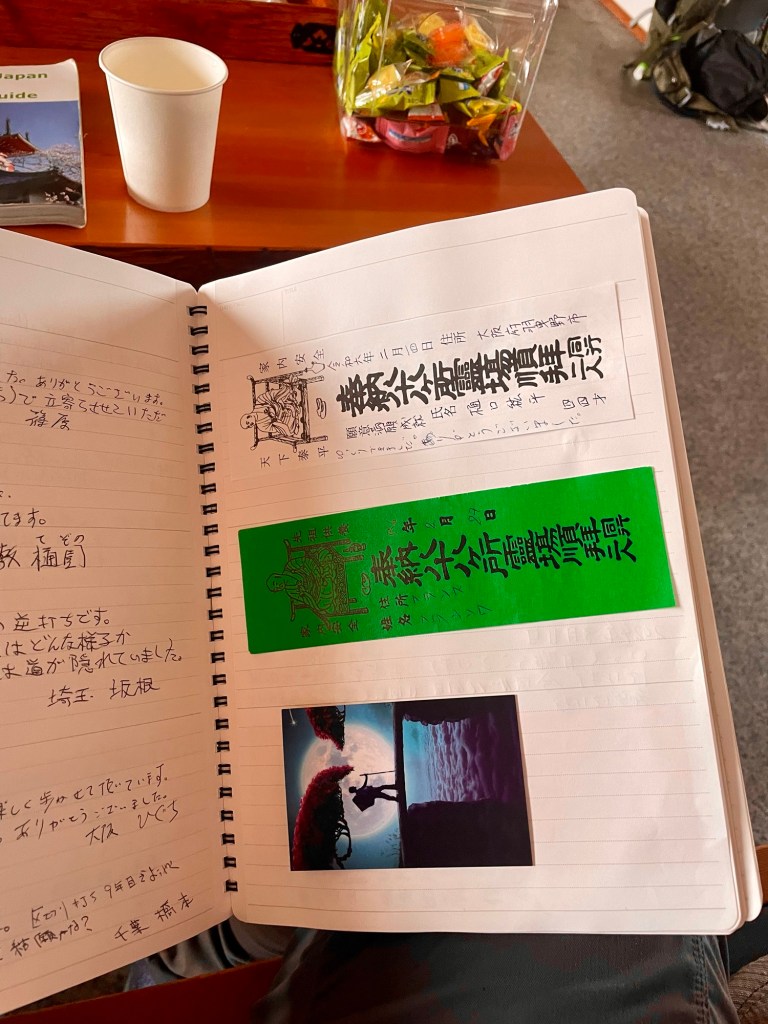 Stopped for a rest in this rest hut. Some shots of the guest book. Guests leave a name slip; the color represents the number of times the pilgrim has completed the pilgrimage.