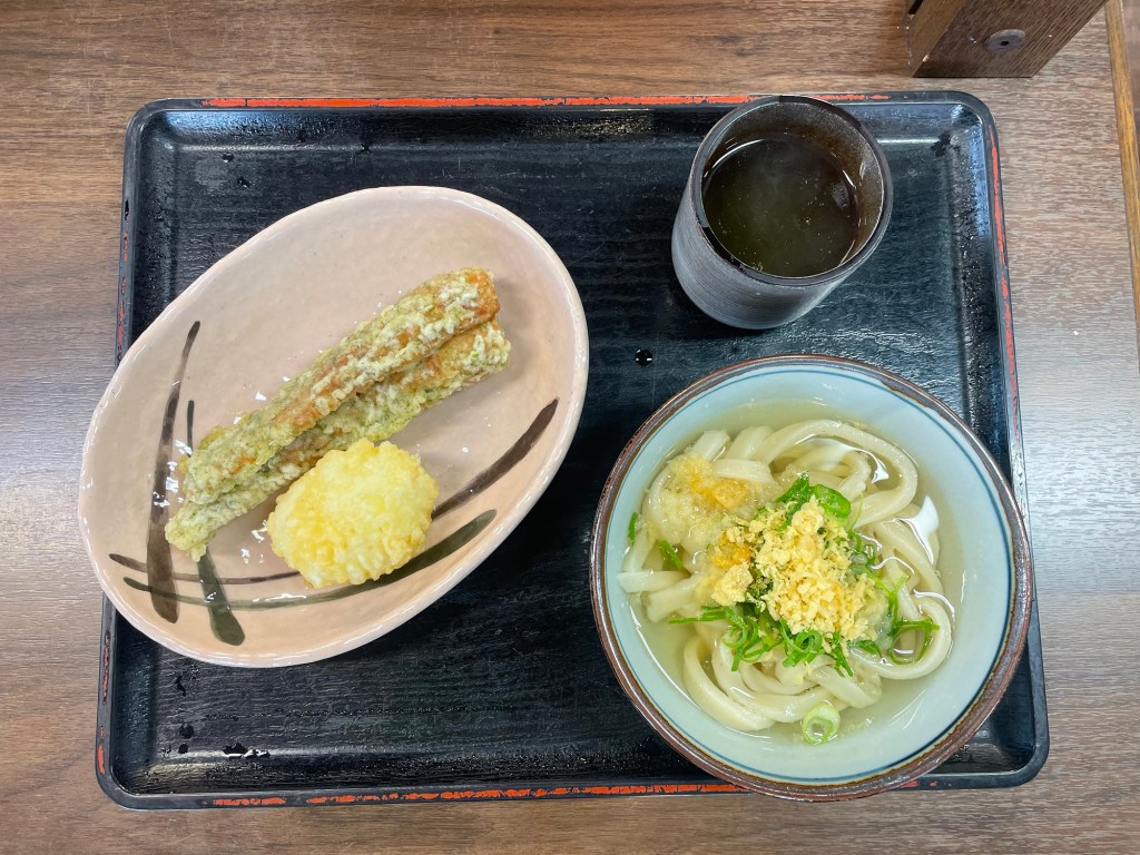 My accommodation didn’t come with breakfast, so I took my time looking for a breakfast spot. Takamatsu is known for udon, which I leaned is a breakfast food. I found a place that opened at nine and timed my walk to get there about when it opened. There were a few folks lined up outside when I arrived, and lots more waiting in their cars (rain). Lucky for me the doors opened moments later, and I got my place in the queue.