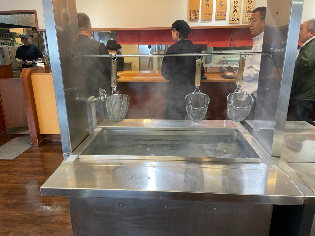 You get your bowl of udon, and then heat it up yourself in a vat of hot water. Then add your own dashi, green onion, and tempura crumb toppings.