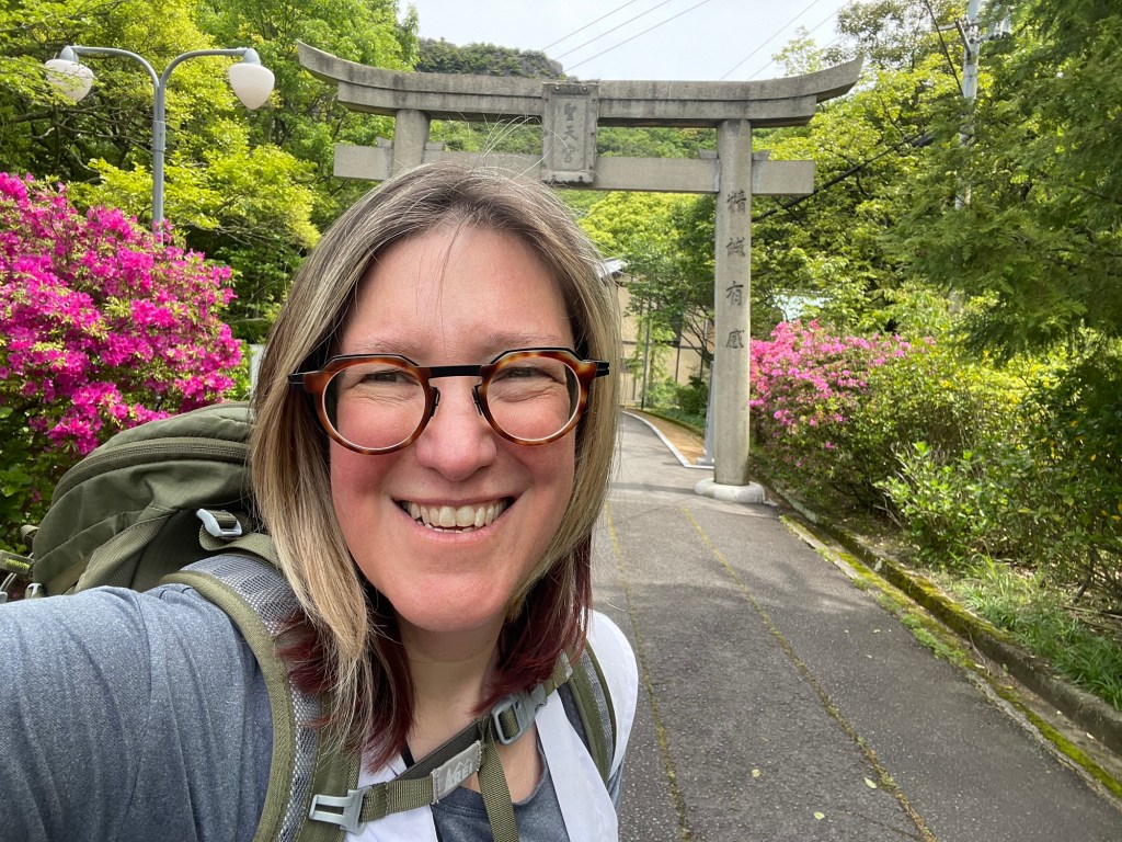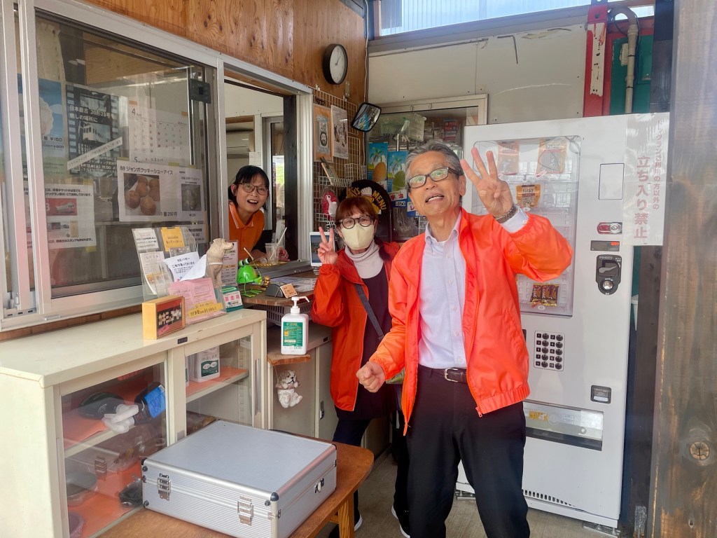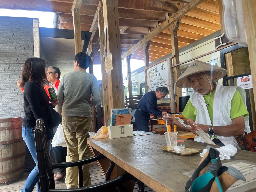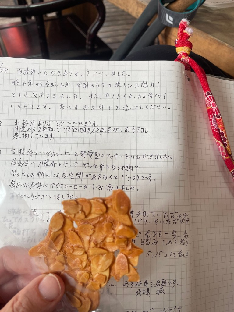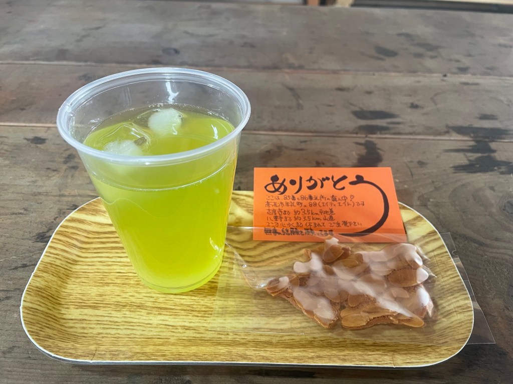 Walking a bit more I heard some excited voices, welcoming me to my first Henro rest stop! The hosts welcomed me with green tea and a snack, and we had a nice chat about the pilgrimage. The host noticed that many of the foreigners hiking the pilgrimage are quite young. I asked another pilgrim what he thought about foreigners walking the pilgrimage. He said he thinks it’s good, and that Japanese people can be lonely. I enjoyed the company and snacks, and on my way out a lady gave me a cup full of the tiniest cherries I’ve ever seen (also very tasty).